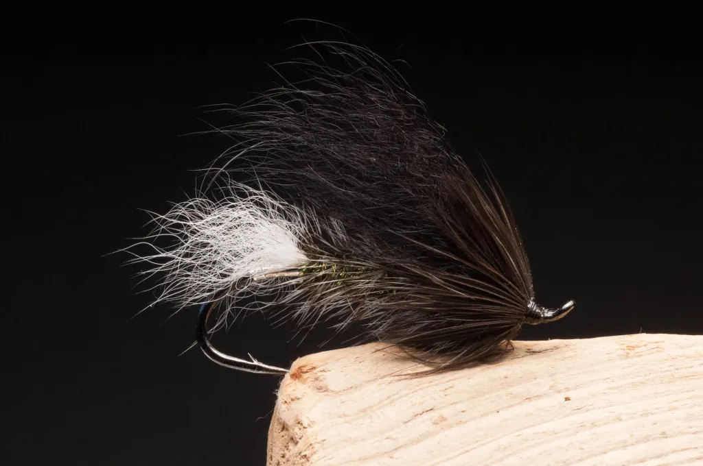 Original, body hackle is a white and a brown hackle cut very short and black squirrel wing, but a few variants have been made and this is one of them with a short grizzly hackle over peacock herl and wing with Arctic fox.