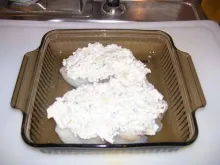 Stack the sauce mixture on the fish, place in the preheated oven (uncovered) and cook for about 30 minutes (after about 20 to 30 minutes check that the fish is getting close to getting done by seeing that the fish will flake away). If you are satisfied with the doneness of the fish sprinkle the parmesan cheese over the mixture, return to the over for about 10 minutes or until the cheese is melted. Remove from oven and let sit for 5 minutes, if the sauce is a bit soupy it will thicken quickly.