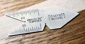 A Starrett Screw gauge used to check the necessary 60 degree angles at every corner of the strips.