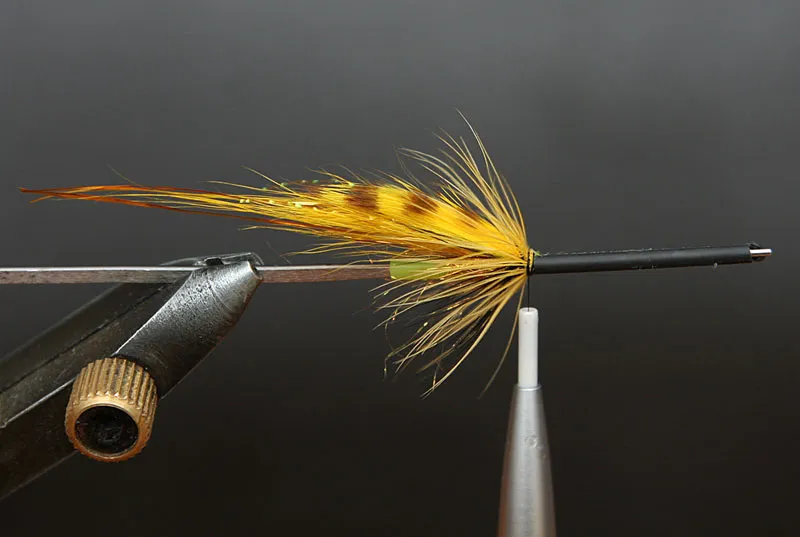 A sparse yellow hackle finishes the fly in front