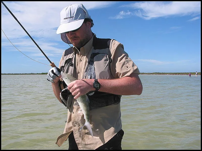 Nils unhooking a medium size bonefish of which we caught many in the murky waters of this lagoon. We could even blind fish for them in the muddy water - a rare situation when bonefishing.