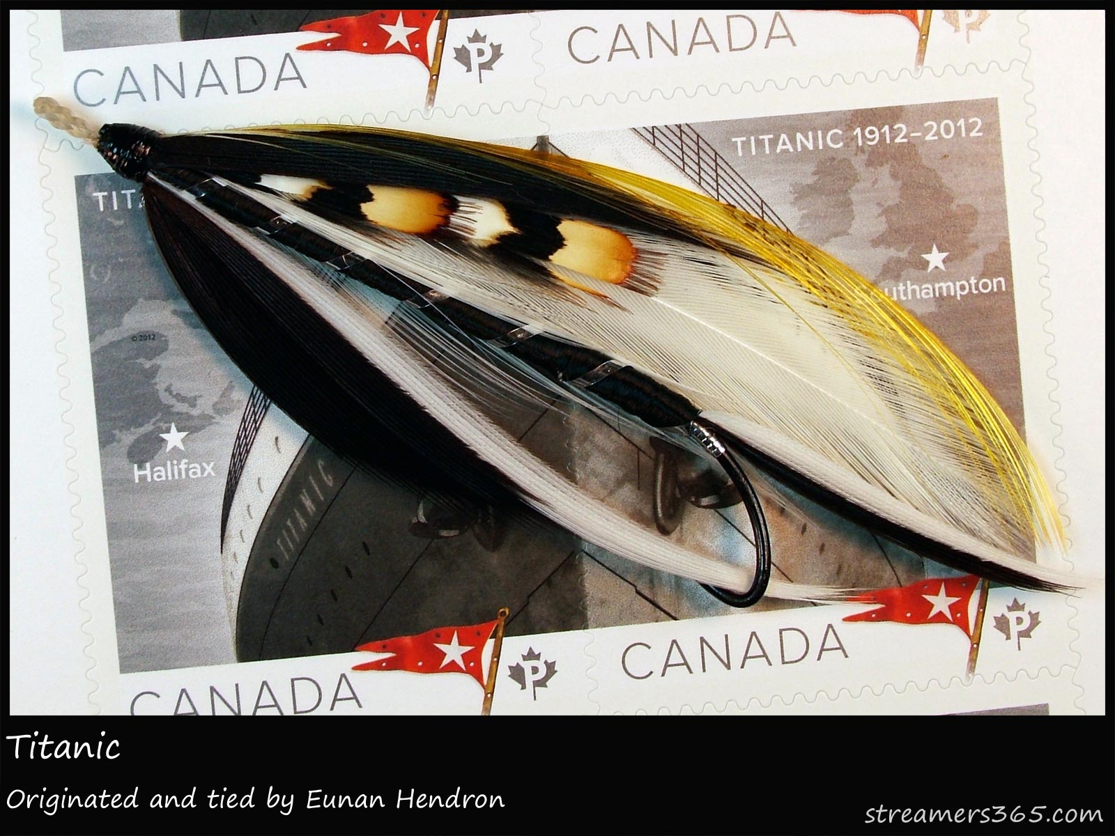 Titanic - Eunan Hendron Tied by: Eunan Hendron Originated by: Eunan Hendron Hook: Mustad Chestertown 3298 Size 9 (blind eye) with gut for eye. Tail:...
